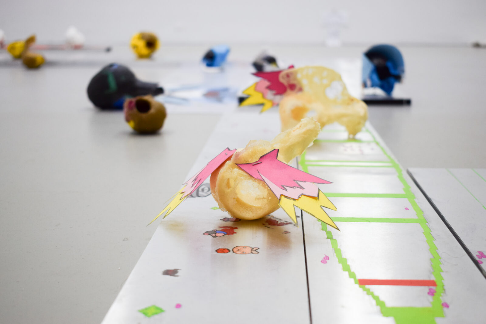 PIECEMEAL is an installation where multiple images and objects coexist and interact. It leads us to approach art making from a position in between image and material, between representation and presentation. From this position, the installation is the result of a five-month ongoing conversation. During this process, we constantly exchanged gestures and proposed answers from our respective backgrounds: from painting in Erisa’s case, drawing in Naomi’s and sculpture in Carla’s. Multiple references are setting the ground for a critical and analytical art-making position that raises a few questions: What would be an eminently contemporary way of making art when it comes to depicting the present? How do we, as a generation, relate to art/visual history?